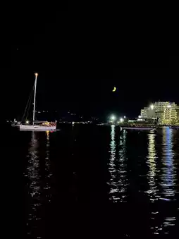 The city lights reflect on the Ionian Sea, creating a sparkling atmosphere along the coastline.