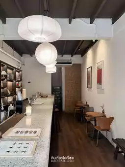 #NewYearNewTrip HOMU, a new home in Sala Daeng area, with a warm atmosphere like a small Japanese cafe, located in a single-storey shophouse in a small alley, but decorated perfectly. The main color is wood, and Japanese lamps are added, giving a simple but charming feeling.