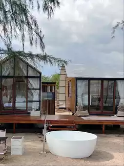 Today, we come to a beach house with a panoramic view at EOD Beach at Mollusc Glamping. It is a twin house where one house is a bedroom and the other house is a living room. Enjoy the sea breeze.