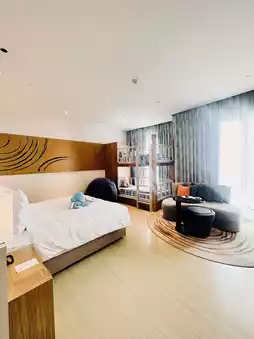 The rooms are spacious, decorated in a contemporary style with a bathtub and beautiful sea views.  The hotel also has a fitness center with a sea view, a spa and a kids club for children.