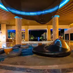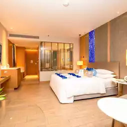 There are facilities such as a large infinity pool, a mini water park for children, a 24-hour fitness center