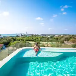 A hotel with a nice atmosphere, near the beach, with a rooftop swimming pool