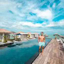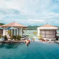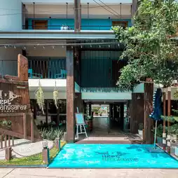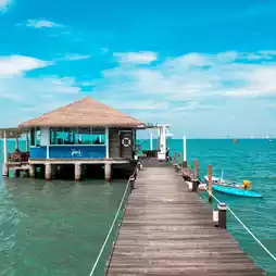 A seaside accommodation with a nice atmosphere. There is a cafe in the middle of the sea.