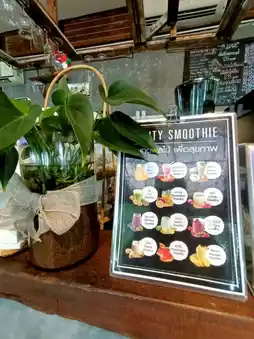 Ton Jaeng Cafe is decorated in a natural style with a sea view. There are indoor seats surrounded by glass that can see through the front of the shop and the sea. The outdoor seats are surrounded by trees. The atmosphere is good.