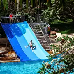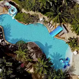 A large swimming pool with fried dough sticks for breakfast
