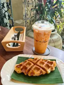 The croffle is very delicious, and the Thai tea tastes better than expected. There are also fresh vegetables and fruits for sale.