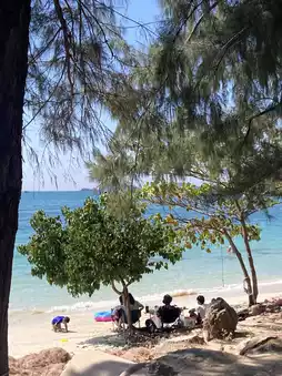 The atmosphere here is quiet and not too crowded. It's suitable for chilling out or swimming. There are places to lay down a mat and sit comfortably on the beach. There are also restaurants and small water shops on the beach.