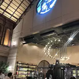 The interior of the cafe is surrounded by a garden and a small pond, and it's like a world in a picture book. It is designed to blend into nature, and the sound of the wind and the sunlight filtering through the trees feel like part of the interior.