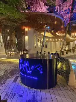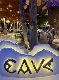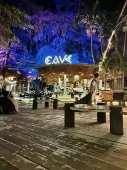 Stepping into Cave Beach Club feels like walking into a tropical island magazine. The entrance is a wooden pathway flanked by vibrant green tropical plants. As you walk further, the sound of waves grows louder, and your mood becomes lighter.
