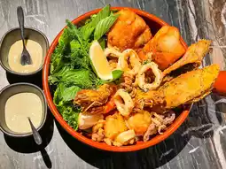 Breaded and fried seafood. The seafood included tiger prawns, Hokkaido scallops, squid, lobster, and fish.
