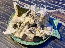 Raw hamachi topped with oranges, guacamole, and ikura in a slightly tangy Peruvian dressing.