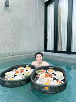 There's a swimming pool and a floating breakfast area.