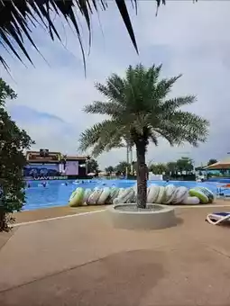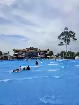 A large wave pool with simulated waves, relaxation areas by the pool, and cabanas available for rent.