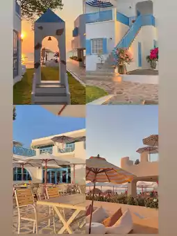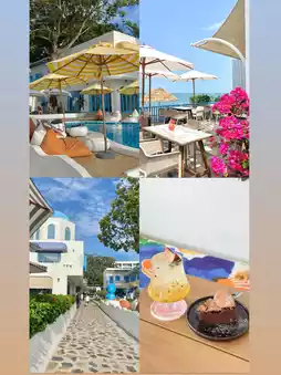 very strong. They have both outdoor and indoor open spaces, or in the cool air-conditioned room, making it feel like you're sitting in a lounge, with a full view of the sea. Every photo spot here is stunning, from the sky, the buildings, or the sea. Every angle is stunning. The outdoor area offers beach views, with tables and chairs on the balcony overlooking the sea. The menu offers both savory and sweet dishes, all in one place. This time, we tried the cakes and drinks. Everything was delicious, but what really impressed me was the watermelon smoothie, which was served whole.