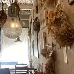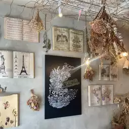 The café features antique-style interiors and furniture, with plenty of dried flowers adorning the space, creating an incredibly charming atmosphere.