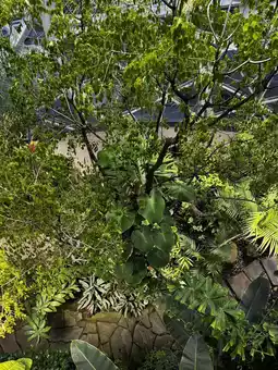 The moment you step into The Spheres, it feels like you're entering a completely different world. It's incredibly quiet inside, with sunlight streaming through the glass roof and illuminating the lush greenery. The atmosphere is truly soothing. The interior is filled with an impressive variety of plants, ranging from tropical ferns to Amazonian trees, making it feel as though a tropical forest has been transplanted right into the heart of the city. Walking along the winding pathways, looking up at the towering trees and hanging vines, you genuinely feel like you're lost in a green maze.