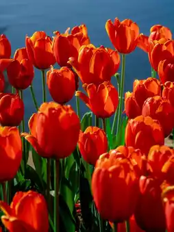 🎨 A sea of red and yellow flowers paired with green trees and lake views