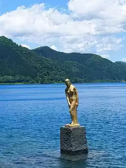 On the shores of Lake Tazawa stands a golden statue of a woman known as "Tatsuko Statue," a popular photo spot for social media enthusiasts. The reflection on the lake adds to its charm. According to legend, a girl named Tatsuko wished for eternal beauty but was transformed into a dragon and became the lake's deity. The statue was erected to commemorate this tale.