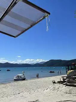 🚣♀️ A cruise boat gliding across the lake, benches by the water’s edge, and flowers swaying in the breeze.