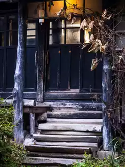 At the entrance, a black wooden sign painted with Japanese calligraphy gradually appears. The thick thatched roof is beginning to sprout green moss, but everything remains strong and peaceful, as if time had never passed.