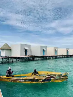 We stayed in a water house. As soon as we opened the door, we could go snorkeling directly in the sea. There was a glass floor under our feet. We could see the fish swimming around below while sitting. It was super healing. There was also a private swimming pool outside the room. I sat there and drank in the breeze. It was super cool!