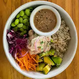 The menu features a fantastic selection of both classic and innovative dishes, making it hard to choose just one! There is a vibrant and refreshing blend topped with fresh strawberries, bananas, chia seeds, granola, and coconut flakes.