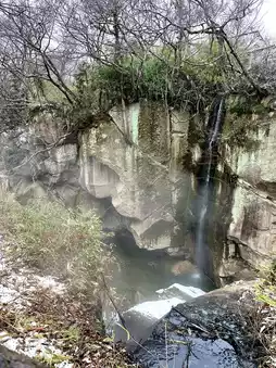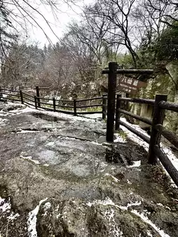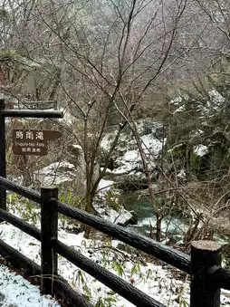 The Nozokibashi Bridge at the entrance to Akiu Onsen Town is almost in the middle of Rairaikyo Gorge, and across the bridge you can see a beautiful valley with huge rocks and strange stones hanging over it for about 1km.