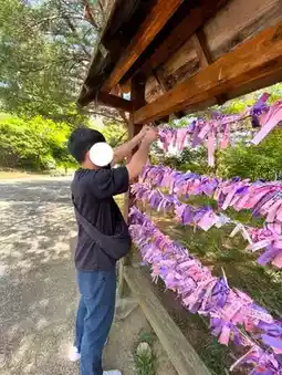 Behind the statue, there is a small shrine. They say that it is very sacred. Start by walking to the small office building next door. Donate 300 yen and you will get a bow to write your wishes. The pink bow is for your love life and the purple bow is for your work. After writing your wishes on the bow, take it out to worship at the shrine and pour oil on the statue inside. Then tie the bow on the outside. (The first time we prayed for a job, it was granted. We went again.)