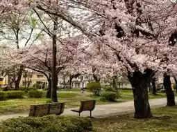 The park features shaded areas, a man-made stream, and playground facilities, making it ideal for children to play. In spring, visitors can enjoy cherry blossoms, while autumn brings vibrant foliage and golden ginkgo leaves. It's a peaceful spot to visit during the day, with few crowds and a relaxing atmosphere.