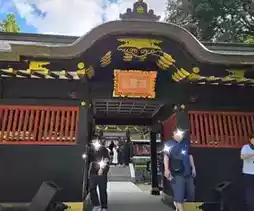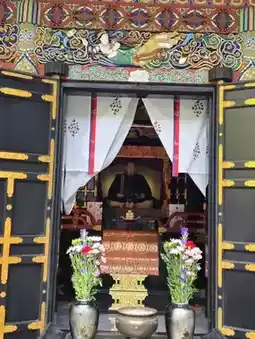 The main gate of Zuihoden is called the "Nirvana Gate." Reconstructed using centuries-old Aomori cypress, the gate features intricate carvings, including the mythical creature "Kirin" on the upper part of the front doors and "Peonies and Chinese Lions" on the side decorations, replicating the pre-war designs.