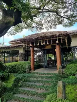 The exterior is a thatched-roof hotel with independent accommodations.