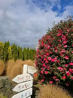 A pretty cafe with lots of places to take pictures with a view of Sanbangsan Mountain.👨👩👧👦. You can pick tangerines and have a cup of tea while looking at camellia flowers, killing three birds with one stone! 🍊🌸 Save time and money, it was so great 🕒💸.