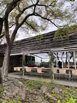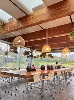 A healing space in the middle of nature with a wide green tea field. A modern building and a warm tea house are in harmony.