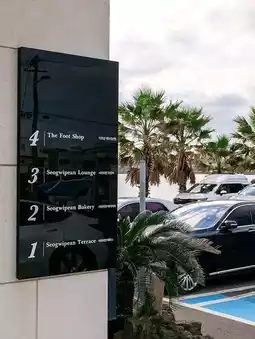 Seogwipian Bakery in Jeju operates daily from 8 AM to 8 PM, year-round without holidays. The café spans three floors, from the first to the third, and upon entering, you'll find a counter where you can place your orders. The interior features a warm wooden design complemented by emotional decorations and flowers, creating a cozy atmosphere, especially during winter. The café offers comfortable tables and chairs for extended stays, and the large windows provide a view of lush green palm trees and an ocean view, making it a recommended spot to visit regardless of the weather.