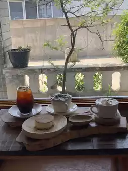The interior is decorated with wooden tables, chairs, rafters, and handicrafts, making it perfect for a solo cafe, small tea gathering, or photo time!