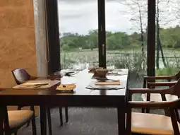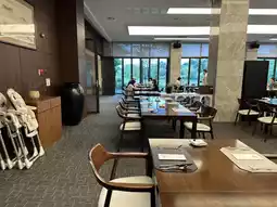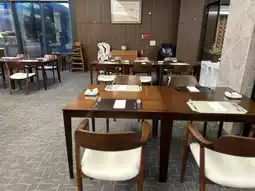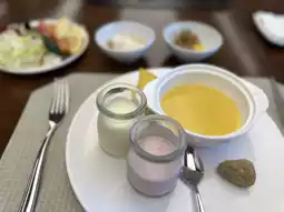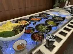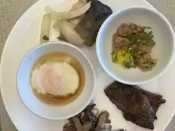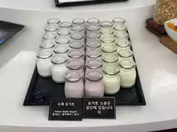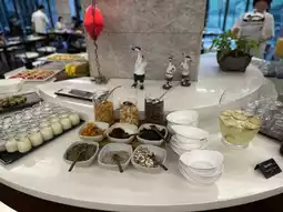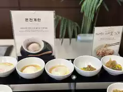 Breakfast is served buffet-style, offering both Korean and Western dishes (including Asian cuisine). Some of the featured items include fermented soybean with aged kimchi and mustard, LA galbi (Korean-style short ribs), and samgyetjuk (a porridge made with chicken and ginseng).