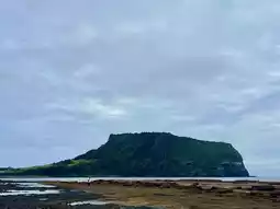 As you drive along the coastal road, what catches your eye first isn’t the sea, but the green grass fields, red rocks, and the silhouette of Ilchulbong 🌄
