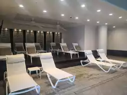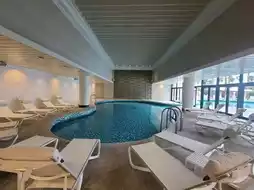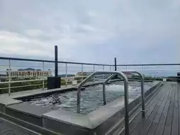 The garden pool on the 1st floor is a heated pool that can be enjoyed all year round. It has an outdoor pool and a kids' pool that extends from the indoor pool to the outside, making it perfect for families. There is also a walking trail behind the pool.
