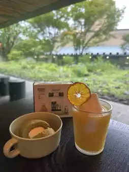 Enjoy a leisurely moment in a cafe space filled with natural light, with a backdrop of open green tea fields, fragrant tea lattes, green tea desserts, and a wide open space. 😀