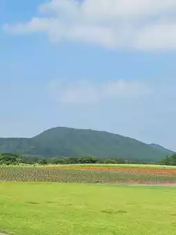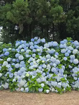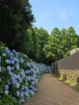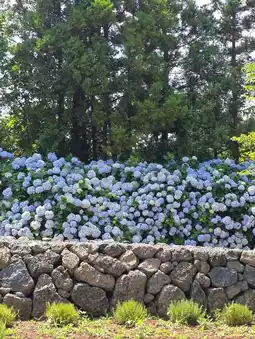 A place where you can see hydrangeas, buckwheat flowers, a spacious yard, and mountains.