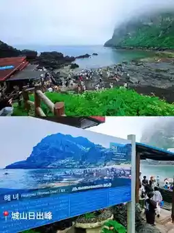The weather in Jeju is unpredictable. Although it was windy and foggy that day, we could enjoy the scenery and magnificent atmosphere of Seongsan Sunrise Peak🏞. Also hiking foot of the embroidery flower exhibition and nearby small shops.