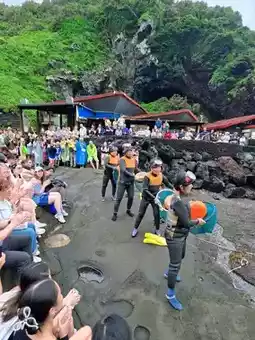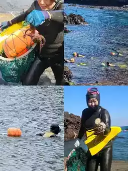 The show is on the seaside under Seongsan Sunrise Peak, and there is a sea girl diving show at 2pm every day. The content has about 10 minutes of sea girls singing traditional songs, they encourage each other to pray for blessings, then prepare the equipment to go out to sea 🤿 bare-handed seafood and show their diving skills, about 10 minutes old to go ashore.