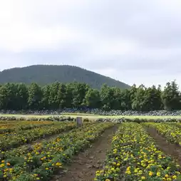 A farm and photo spot with seasonal flower fields, from purple rapeseed and green barley in spring, hydrangeas and lavender in early summer, and buckwheat and pink muhly in fall