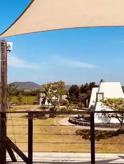 Nestled in Jeju’s countryside, in the Around Follie lodge, the Airstream 17 Ft roomdelivers a stylish and comfy escape. At 9m², it’s compact yet fully equipped—air conditioning, private bathroom, Wi-Fi, and minimalist charm. Large windows frame views of Nasiri Oreum, casting golden morning light you’ll never forget. It’s peaceful and clutter-free, inviting deep rest. The trailer sits close to A-Ground café, where homemade syrups elevate your iced coffee game. Price: KRW 139,574 (incl. taxes & fees; free cancellation until Sept. 25) Tip: Pack warm socks and a hoodie—stargazing outside gets chilly after dark.