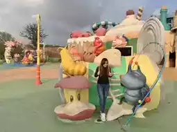 The park isn’t very big, but it’s super colorful and cheerful, with lots of Larva-themed rides and photo spots 🐛.