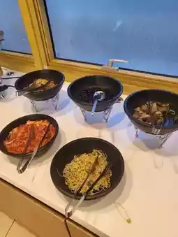 The breakfast has a wide selection of Western and Korean dishes, including porridge, noodles, and rice. The Korean side dishes are plentiful and can fill you up, making it cheaper than buying bread and coffee. However, buying breakfast on site is more expensive, at 14,000w, compared to the price you paid when booking.