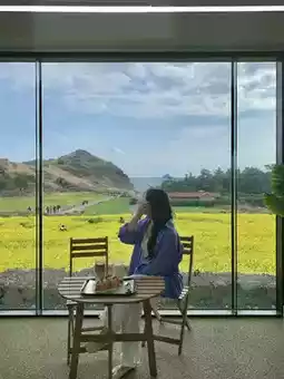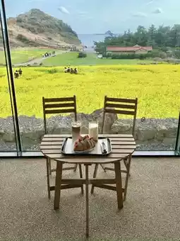 Starting from March, you can enjoy the canola flower fields at Cafe Sosaekchaebon. The cafe offers a panoramic view of the canola flowers through its large windows, and it's conveniently located near Yongmeori Coast, making it a great spot to visit together. Behind the cafe, you can also enjoy a view of Sanbangsan Mountain! The desserts and coffee here are delicious as well.
