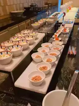 In the cold food section, you can find fresh salads, fruits, yogurt, smoked salmon, various breads, and desserts. The hot food section offers a rich selection including eggs benedict, hamburger steak, pho, pancakes, sausages, and bacon.