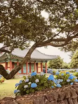 More than just a beautiful garden, Honinji bursts into life with vibrant blue hydrangeas, creating a breathtaking scene that connects visitors to Jeju’s foundational history. Amidst the flourishing blooms, the central pond and the three nearby basalt caves—traditionally known as the bridal homes of the three mythical couples—offer a deeper cultural experience. Stroll through the hydrangea-lined paths and take the time to read the plaques or admire the folk-art murals behind the community hall, which detail the legend of the Samsinin and the princesses. This lush setting transforms a simple nature walk into a meaningful journey, tracing the origins of the Tamna kingdom. It's a compulsory stop for history lovers and those keen to understand the island’s unique identity amidst a sea of blue blossoms.