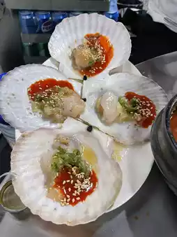 The clams are perfectly purged, leaving no fishy smell, and their clean taste bursts with the rich flavors of the sea. From abalone to scallops and turban shells, the variety is visually delightful and incredibly tasty. 🐚🔥